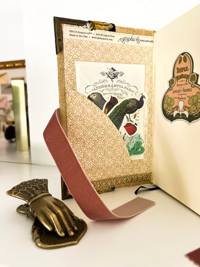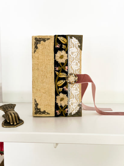 Estos cedernos son 100 artesanales, realizados con terciopelo, cintas bordadas y broches vintage. Guardas cubiertas con papel Graphic45, y etiqueta antigua de perfumería.