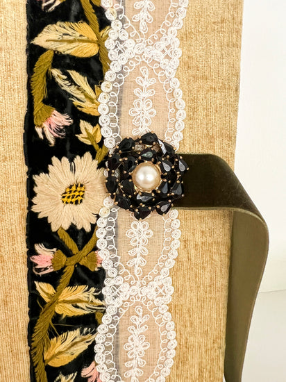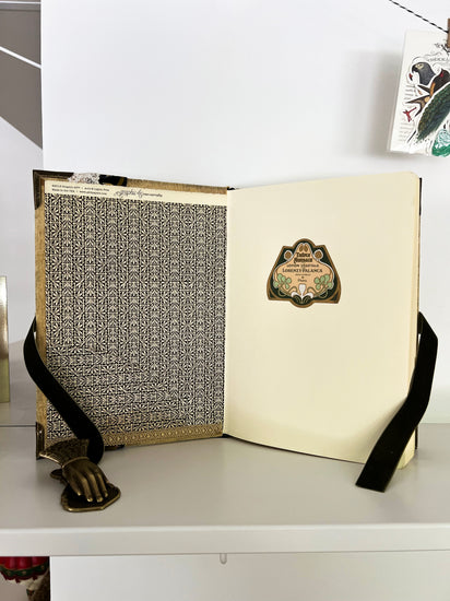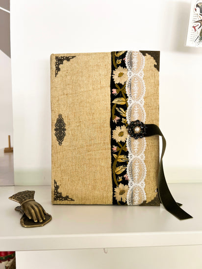Estos cedernos son 100 artesanales, realizados con terciopelo, cintas bordadas y broches vintage. Guardas cubiertas con papel Graphic45, y etiqueta antigua de perfumería.